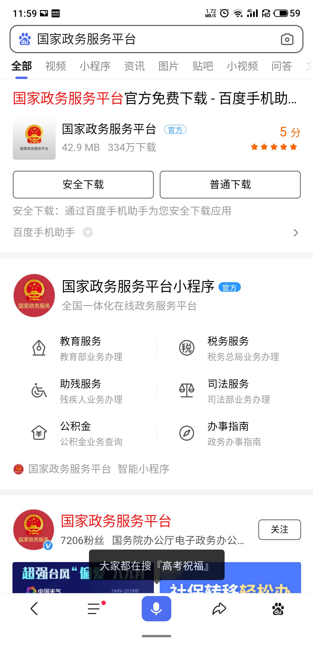 第一步:進(jìn)入百度,搜索國家政務(wù)服務(wù)平臺小程序,進(jìn)入小程序,找到教育服務(wù),點(diǎn)擊『更多』