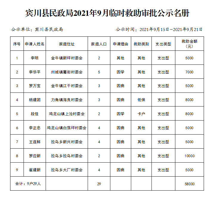 大理市賓川縣民政局2021年9月臨時救助審批公示
