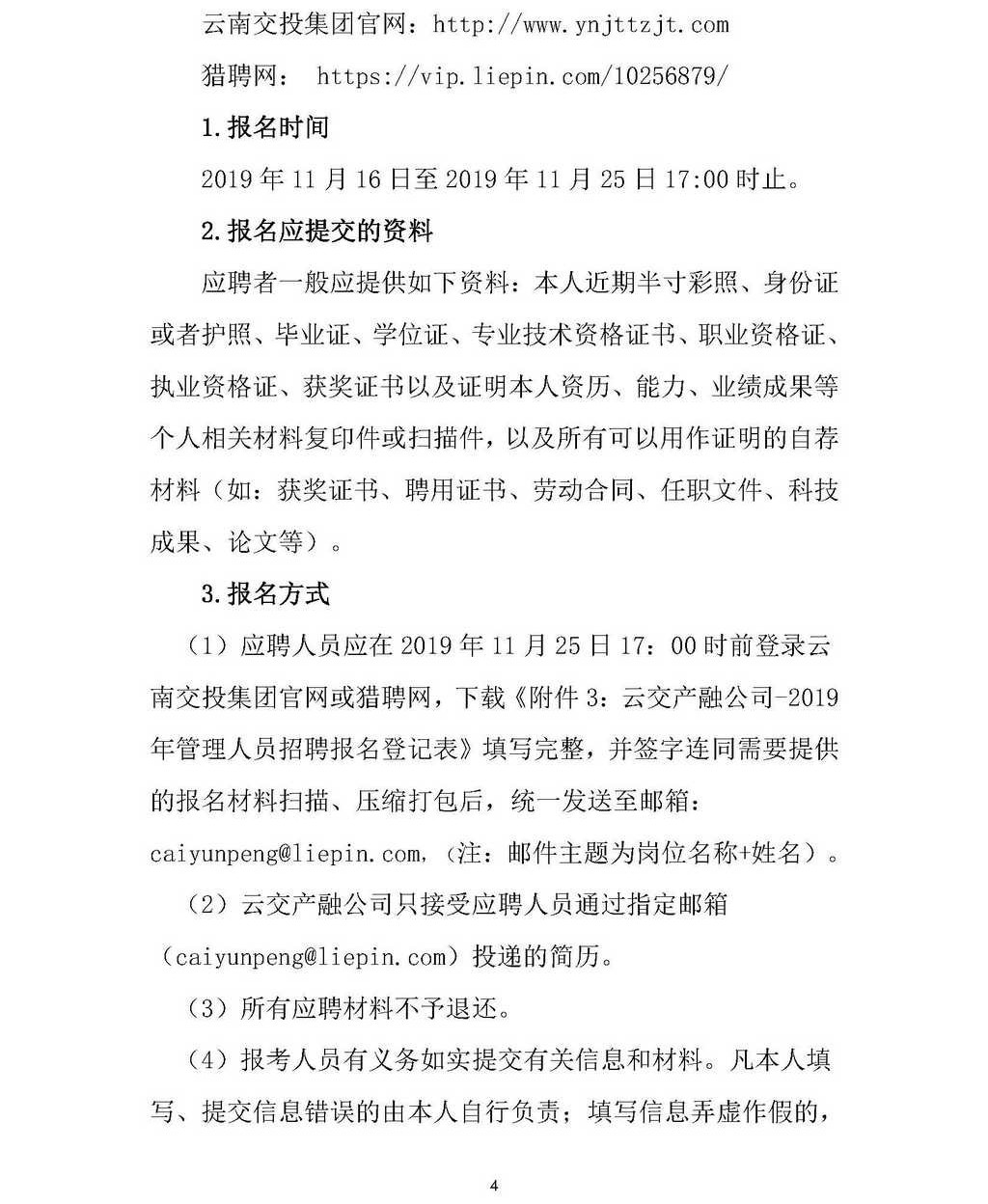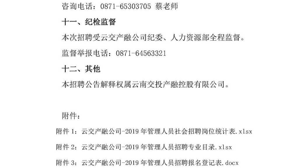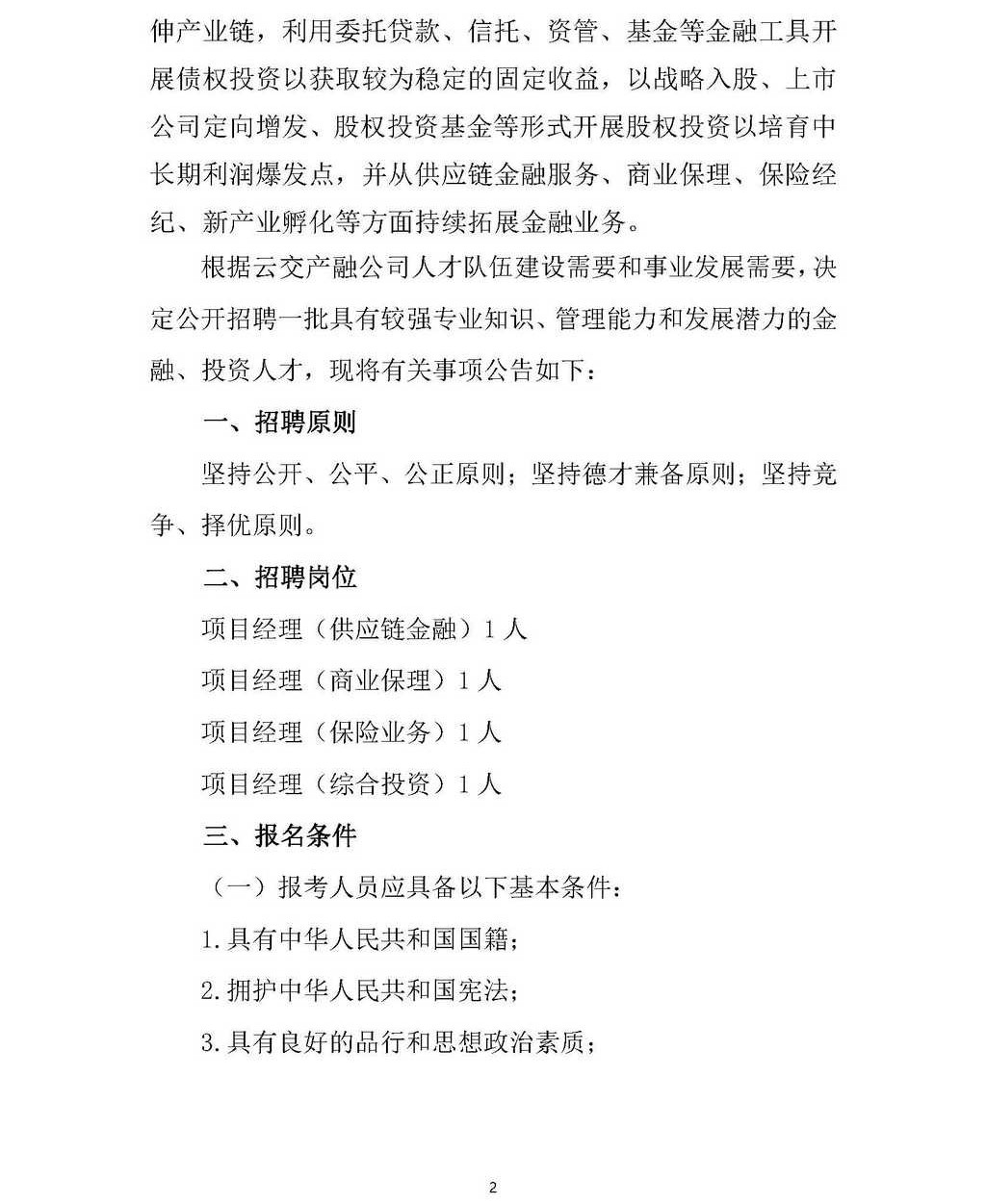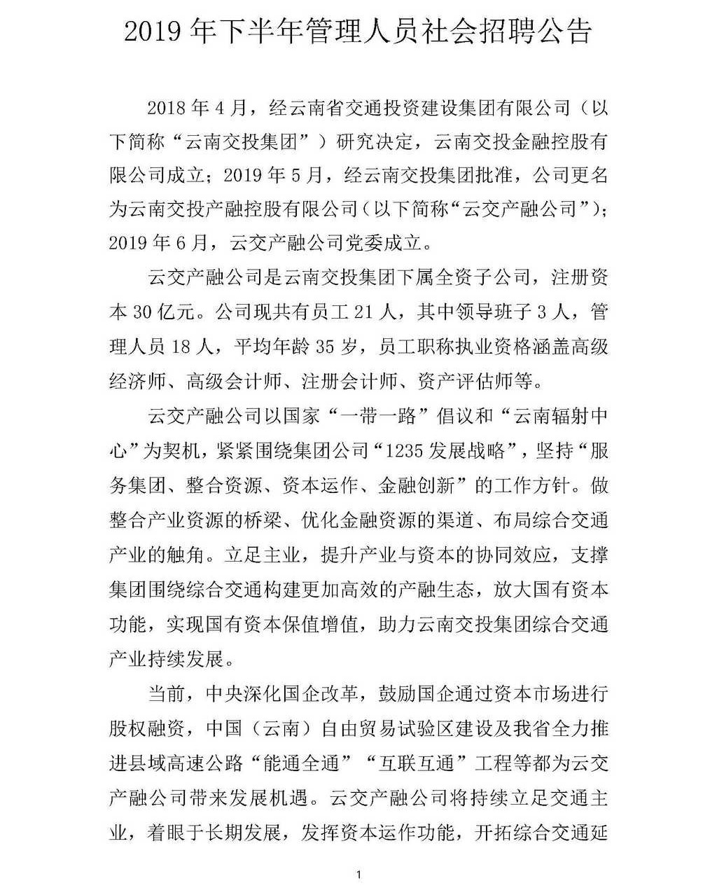 云南交投產融控股有限公司2019年下半年管理人員社會招聘公告